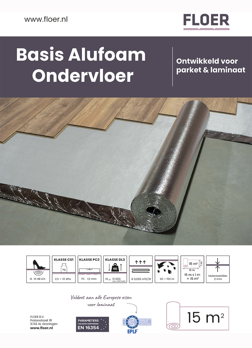 Voor welke vloeren is deze ondervloer geschikt? Alufoam is als ondervloer geschikt voor laminaat en parket vloeren en bovendien afgewerkt met een handige overlap. Een rol heeft een lengte van 1500 cm en een breedte van 100 cm en bedekt 15 m2! Ontdek alle voordelen van deze ondervloer.