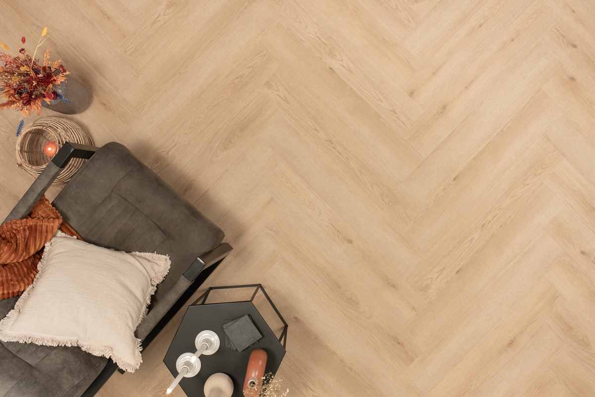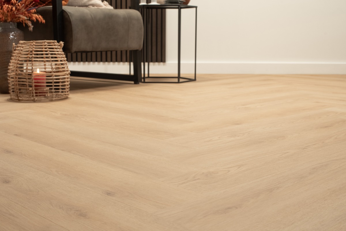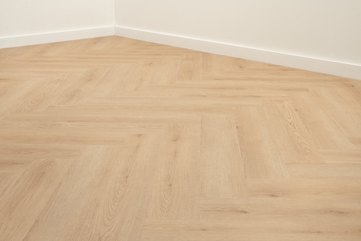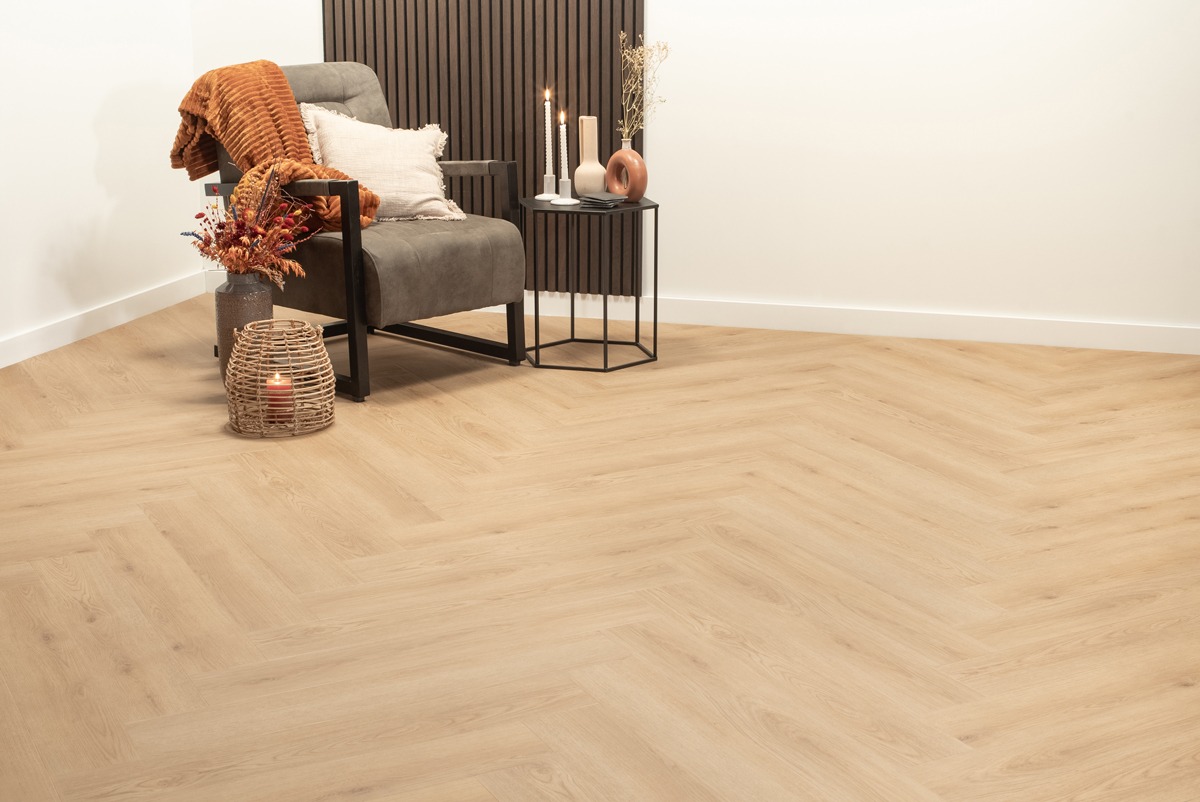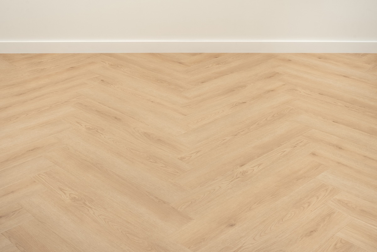 Ontdek het Floer Walvisgraat Click PVC, groot en indrukwekkend visgraat PVC dat zelf te leggen is! In deze lichtbruine kleur, heeft het Walvisgraat Click PVC – Bryde Bruin de uitstraling van een écht eiken houten vloer, maar dan gecombineerd met alle voordelen van klik PVC. Deze grote klik PVC vloeren in een visgraat patroon zijn de grotere, brede en langere versie van de “standaard” visgraat klik PVC vloeren. Ze zijn uitgerust met een rigide mineralen kern: hierdoor liggen ze uiterst stabiel op de grond en zijn ze 100% waterproof.