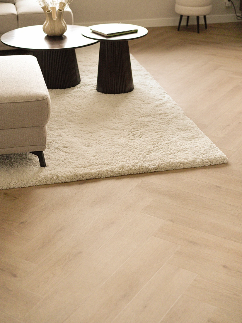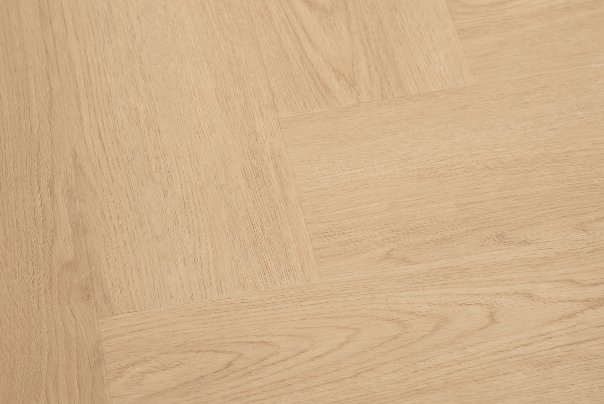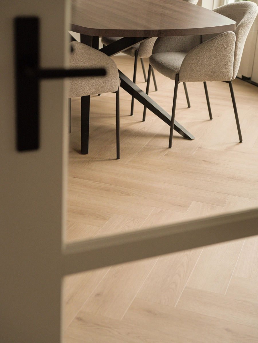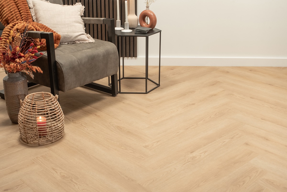 Ontdek het Floer Walvisgraat Click PVC, groot en indrukwekkend visgraat PVC dat zelf te leggen is! In deze lichtbruine kleur, heeft het Walvisgraat Click PVC – Bryde Bruin de uitstraling van een écht eiken houten vloer, maar dan gecombineerd met alle voordelen van klik PVC. Deze grote klik PVC vloeren in een visgraat patroon zijn de grotere, brede en langere versie van de “standaard” visgraat klik PVC vloeren. Ze zijn uitgerust met een rigide mineralen kern: hierdoor liggen ze uiterst stabiel op de grond en zijn ze 100% waterproof.