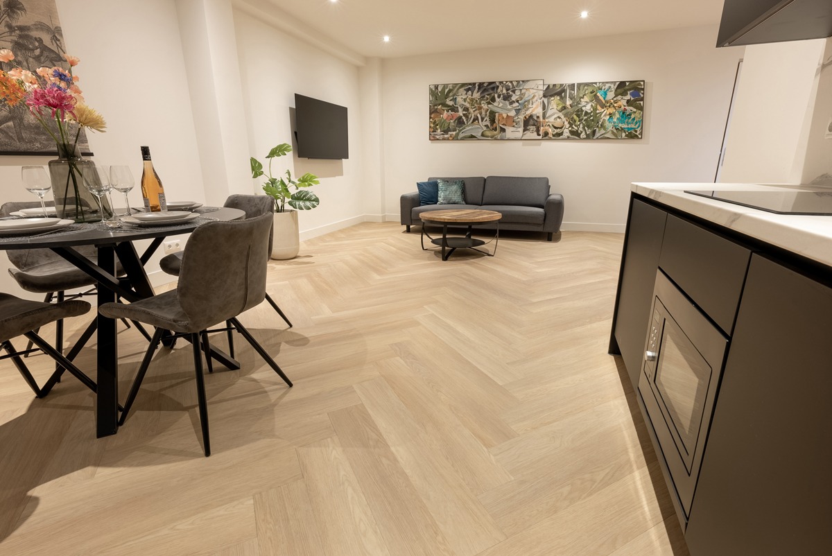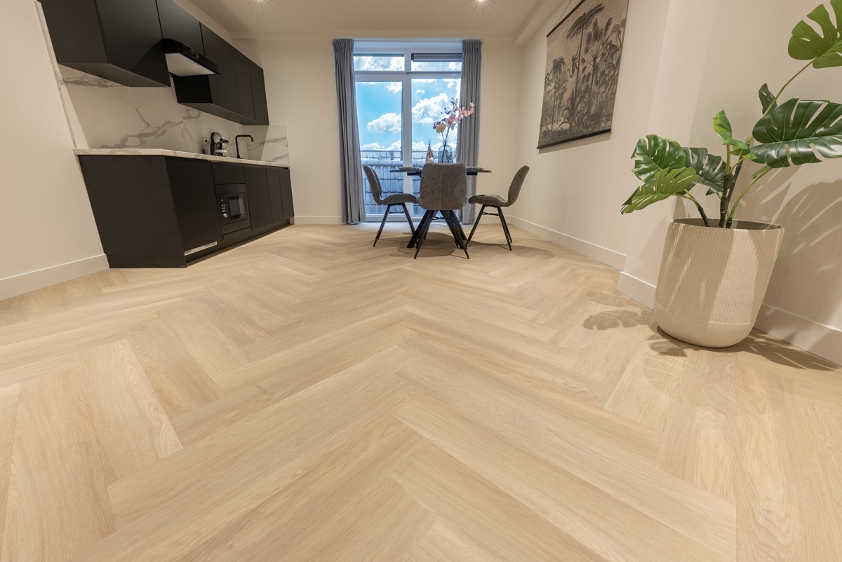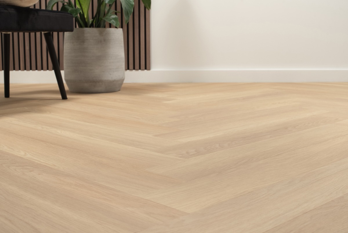 Maak kennis met het bijzondere Floer Walvisgraat Click PVC – Noordkaper Natuur, een indrukwekkende en prachtige vloer die ook nog eens zelf te leggen is! In de elegante natuurlijke tint straalt deze Walvisgraat Click PVC vloer de allure uit van een authentieke eikenhouten vloer met alle voordelen van klik PVC. Deze grote klik PVC vloeren in een visgraat patroon zijn de grotere, brede en langere versie van de “standaard” visgraat klik PVC vloeren. Omdat de Walvisgraat PVC klik vloeren zijn voorzien van een rigid core mineralen kern liggen ze uiterst stabiel op de grond en zijn ze 100% waterproof.