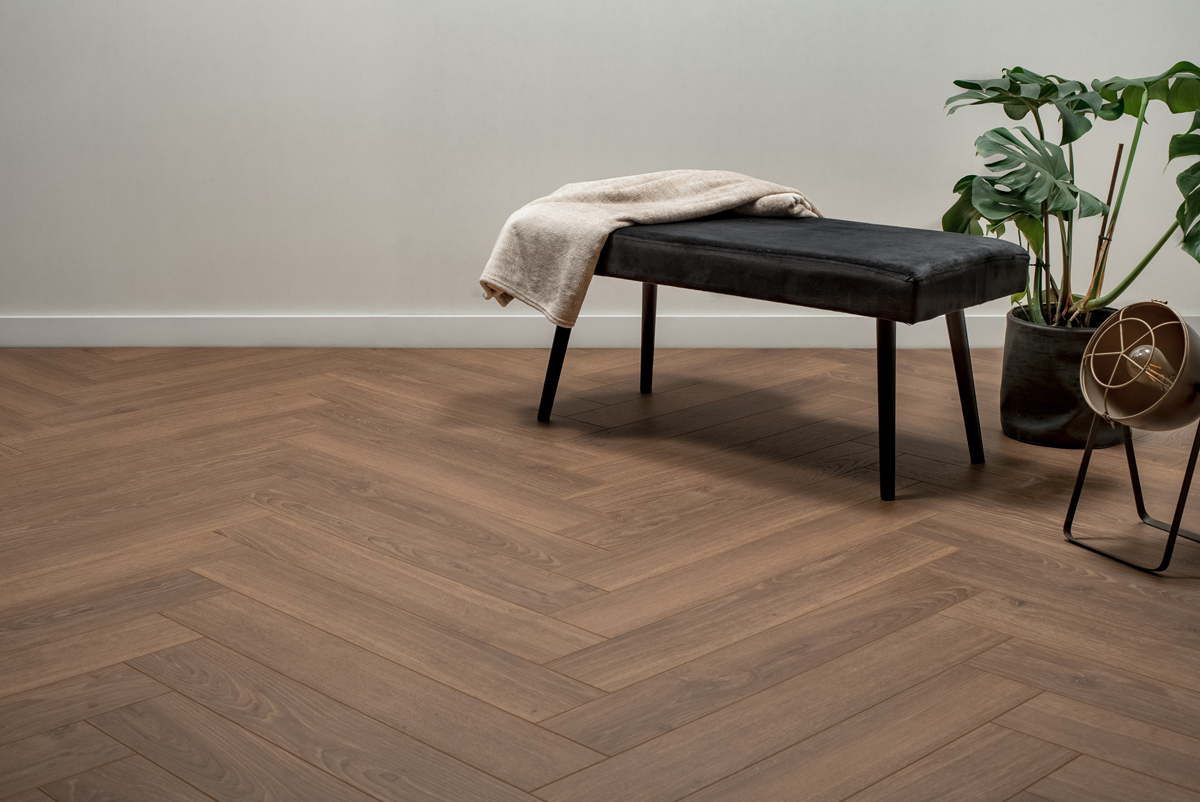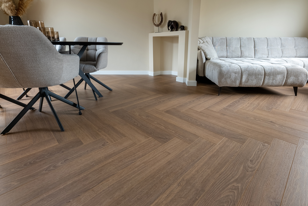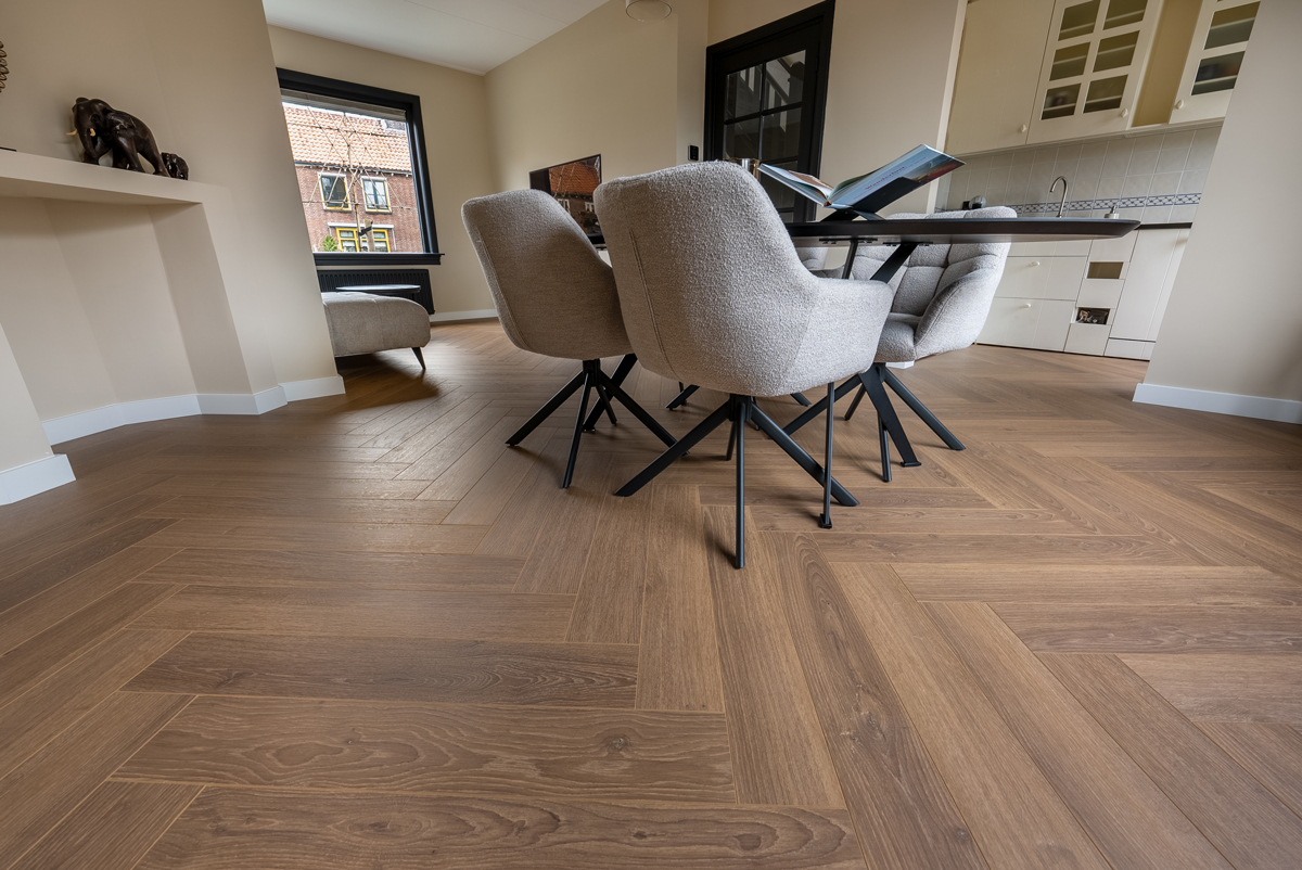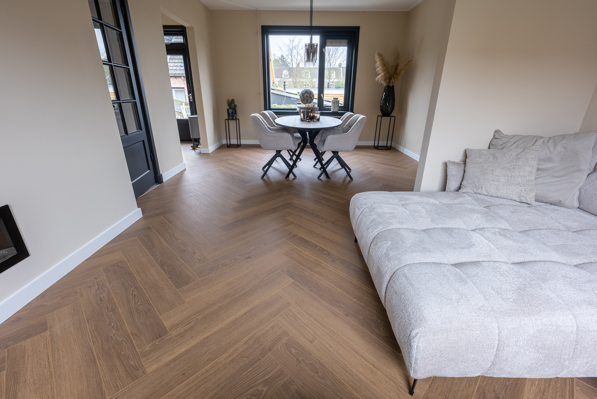 Met het Floer Walvisgraat Laminaat – Bultrug Bruin haal je de natuur in huis. De authentieke bruine eikentint zorgt voor een warme basis die rust brengt in je interieur. Waar een standaard visgraatvloer soms wat druk kan ogen, zorgt dit XL-formaat (‘Walvisgraat’) juist voor een ruimtelijk en statig effect. De planken zijn langer en breder, waardoor je woonkamer optisch groter lijkt.