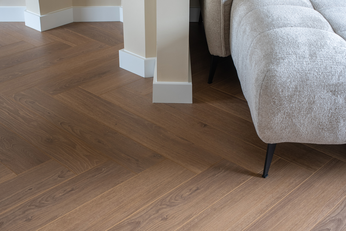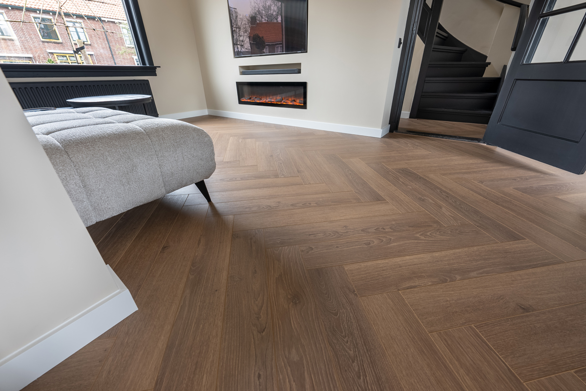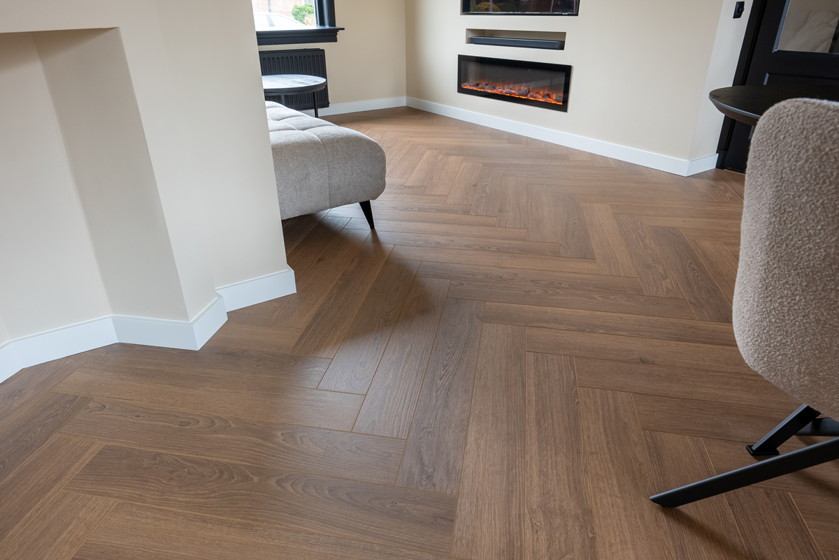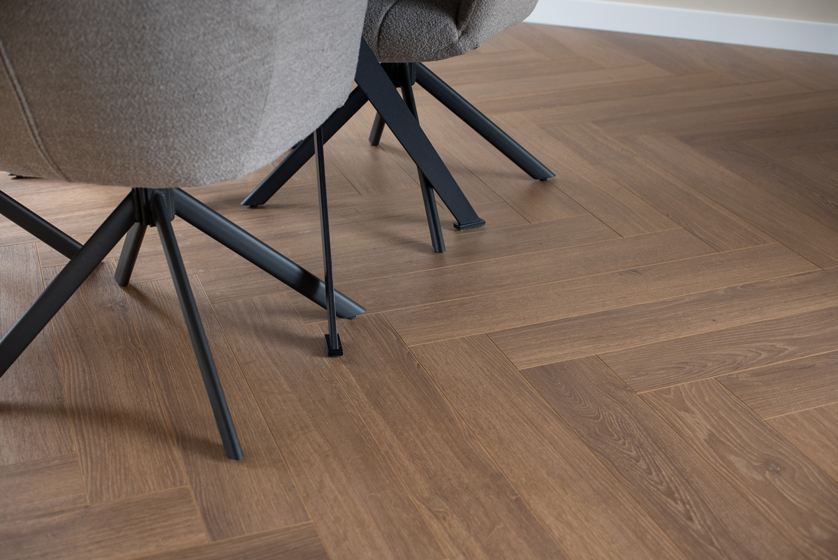 Met het Floer Walvisgraat Laminaat – Bultrug Bruin haal je de natuur in huis. De authentieke bruine eikentint zorgt voor een warme basis die rust brengt in je interieur. Waar een standaard visgraatvloer soms wat druk kan ogen, zorgt dit XL-formaat (‘Walvisgraat’) juist voor een ruimtelijk en statig effect. De planken zijn langer en breder, waardoor je woonkamer optisch groter lijkt.